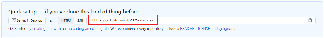 - 생성된 깃허브 원격저장소 주소가 아래와 같이 표시된다면 원격저장소 생성 끝!