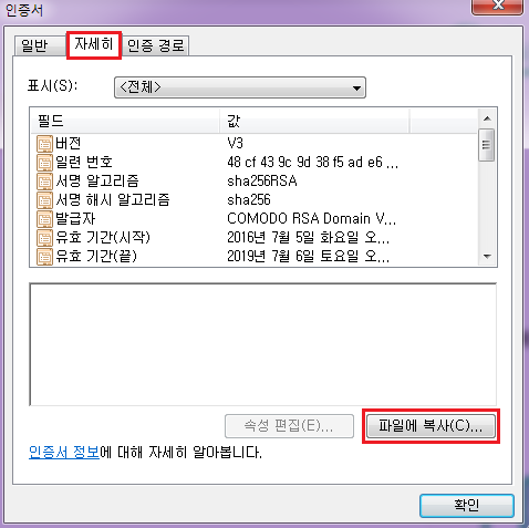 인증서 [자세히] 탭 선택 후 파일에 복사 선택 합니다.